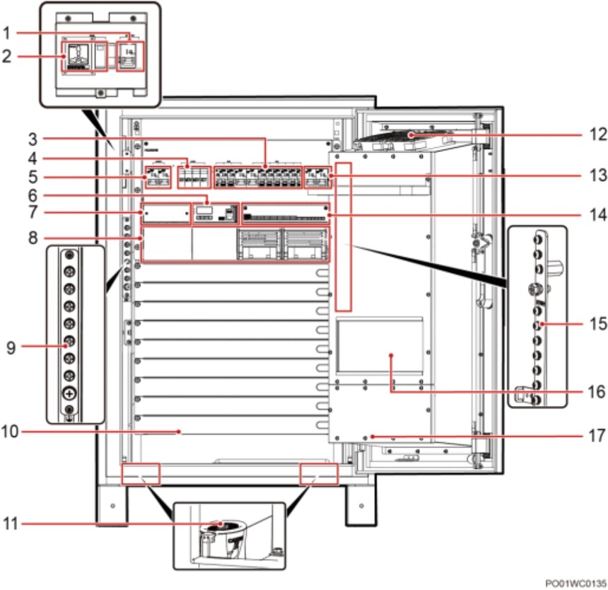 (1)交流输出空开和端子 (2)万能插座和保护开关 (3)直流输出空开 (4)交流防雷器 (5)交流输入空开 (6)监控模块 (7)电池强制上电开关 (8)整流模块安装空间 (9)接地排 (在盖板后面) (10)用户设备安装空间 (11)走线袋 (12)内循环风扇 (13)电池空开 (14)用户接口模块 (15)RTN+母排