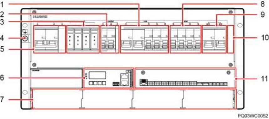 ( 1 )LLVD空开 (2)交流输出空开和端子 (3)交流防雷器 (4)接地螺丝 (5)交流输入空开和端子 (6)SMU02B ( 7 )整流模块安装空间 (8)BLVD空开 (9)电池空开 ( 10)电池强制上电开关(盖板 ( 11 )UIM02C 后) 图 3-4 ETP48200-C5B5 交直流配电单元