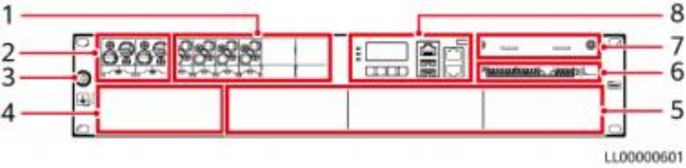 ( 1 )负载空开及预留安装空间 (2)电池空开(智能空开) (3)接地螺丝 (智能空开) (4)交流输入模块安装空间 (5)整流模块安装空间 (6)用户接口模块UIM05D1 ( 7 )通信扩展模块安装空间 (8)监控模块SMU02C