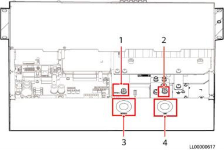 ( 1 )RTN+(用于扩展配电) (2)-48V(用于扩展配电) (3)RTN+出线孔 (4)-48V出线孔